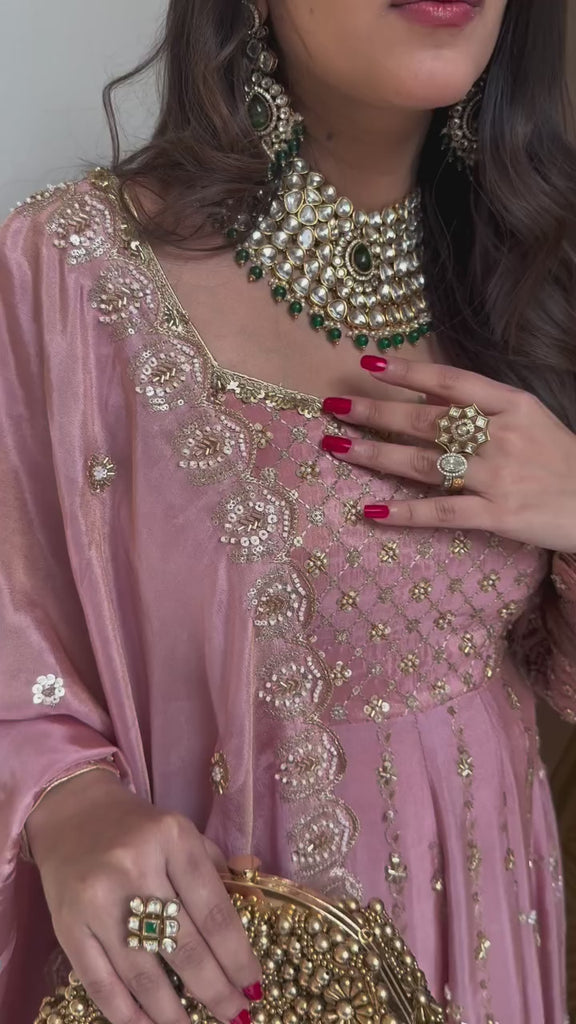 Add timeless elegance to your ethnic collection with this Blush Pink Crap Silk Hand Embroidered Anarkali Suit Set. Crafted from premium quality crap silk fabric, this outfit features intricate hand embroidery that enhances its rich and graceful appeal. The soft texture and elegant flare make it a perfect choice for weddings, festive occasions, parties, and traditional celebrations. Paired with a matching embroidered dupatta, this fully stitched ensemble offers comfort, luxury, and a flattering silhouette.